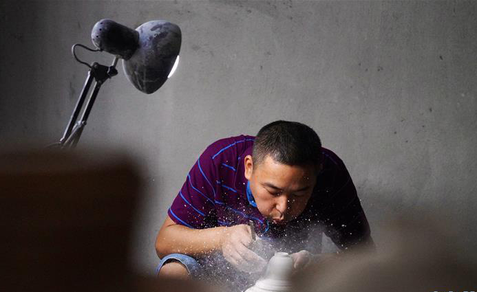 團(tuán)隊(duì)成員江陪華在進(jìn)行利坯工序。