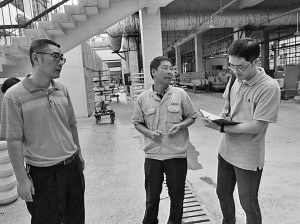 江西景德鎮(zhèn)紅葉陶瓷股份有限公司第一分廠黨總支書(shū)記江盛泉(中)向記者介紹電窯爐的優(yōu)點(diǎn)。