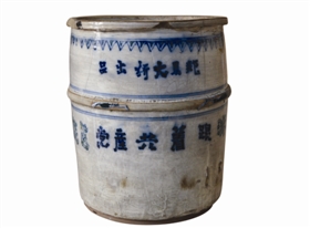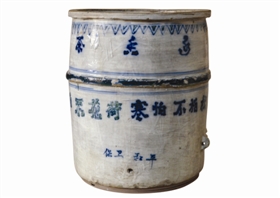 該物器型的造型略顯拙樸,地方色彩濃厚。由于器型之大,在燒制的過程中增加了技術難度,以致在器體出現(xiàn)了部分脫釉的瑕疵。因為它是實用器,屬公共場合置放之物,在人們的頻繁使用中損傷也是在所難免的,在該桶沿處有磕碰、殘損、裂紋,在桶的下方左右四個耳系殘缺了三個。其他部位完好,不妨礙整體鑒賞效果。該茶水桶器體上的字體書寫風格比較隨意,例如“能”字只書寫右半邊,若單獨出現(xiàn)是很難辨讀的,這與當時技工的書寫習慣有關,字體書寫水平一般,這在當時全國文盲率高達90%以上的國情來說,是情有可原的。姑且不言工匠的藝術功底高低,因為這些已顯得并不那么重要了,重要的是器物在缸體上反映的文字信息,就足以令人驚嘆。制作者的創(chuàng)意已充分顯示出,那一時期的干部工人和全國的翻身人民一樣,他們在黨的正確領導下,滿懷激情地投身于新中國的經(jīng)濟建設之中,把對黨的無比熱愛之情躍然在器身之上,這才是創(chuàng)意和制作者所賦予該茶水缸的初心內(nèi)涵亮點。
