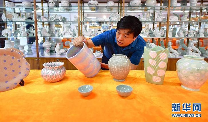 在河南省焦作市修武縣當(dāng)陽峪村,“當(dāng)陽峪絞胎瓷燒制技藝”國家級(jí)代表性傳承人柴戰(zhàn)柱采用絞胎技法,將不同花色的泥塊重組在一起。