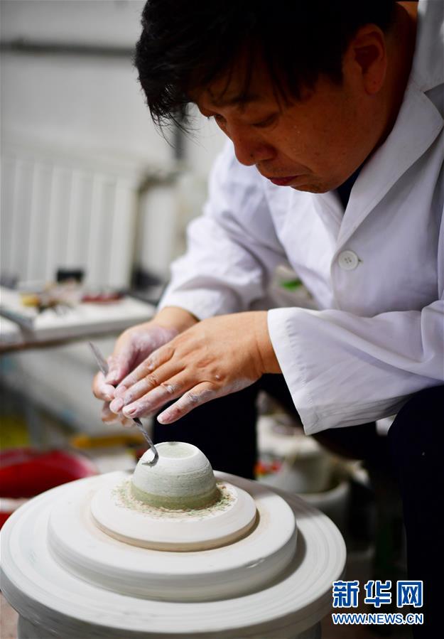 在河南省焦作市修武縣當(dāng)陽峪村,“當(dāng)陽峪絞胎瓷燒制技藝”國家級(jí)代表性傳承人柴戰(zhàn)柱在修坯。