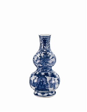 該器體積龐大,是壁瓶中的佼佼者。通體以青花為飾,青花發(fā)色藍(lán)艷,層次分明,畫面布局飽滿?谙嘛椧恢芑刈旨y。頸部開(kāi)光,繪團(tuán)龍紋。上腹部,繪青花太湖石、樹(shù)木花草。下腹部繪人物。畫面中間一人,端坐高背椅上,手執(zhí)靈芝,頭戴發(fā)冠,道骨仙風(fēng)。四周站滿了著官服的人。畫面似乎是在描繪明朝“道君皇帝”嘉靖帝的故事。