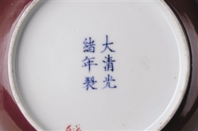 光緒官窯瓷器的款識,“大清光緒年制”六字篆書青花款和六字楷書青花款并用,在部分單色釉器,特別是茶葉末器上則用刻款。民窯器尤為多見“光緒年制”四字抹紅楷書款。