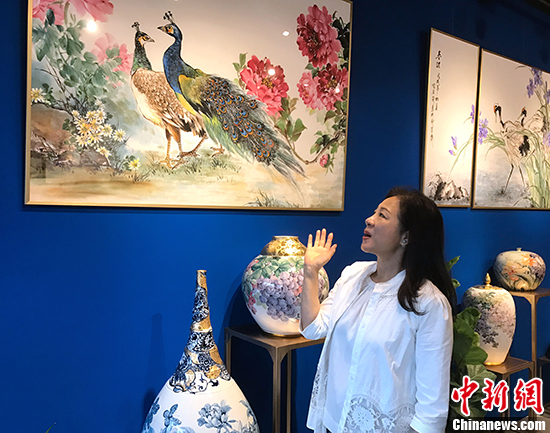 趙屏蘭女士介紹將帶去個展的國畫和陶瓷作品。