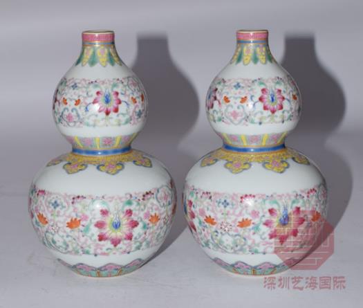 本品于乾隆御制彩瓷之中堪稱別致,巧取葫蘆為形,尊貴秀雅,裝飾雍容華麗,圃簇繁麗,上下相映,各盡其妍,使人仿佛置身百花叢中,目不暇接。其設計獨具匠心,畫面雖繁密卻不亂,花葉分布各有主次,婉轉舒展,頗見柔美之姿。其筆意精美絕倫,彩料妍亮,色彩搭配與轉換之妙又恐非言語可表。為乾隆時期景德鎮(zhèn)御作經(jīng)典樣式,圖案設計雅致尊貴,為此類工藝品中最具格調之御瓷佳作。當景德鎮(zhèn)御瓷藝匠采用乾隆早期于北京開發(fā)之嶄新工藝時,此類極富奢華品位之裝飾應運而生。