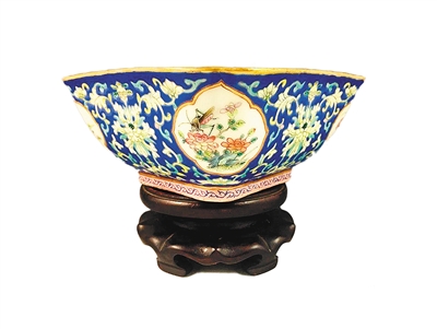 蟲草紋細(xì)路粉彩碗。這是一只產(chǎn)于清代的細(xì)路粉彩碗,碗口呈倭角狀,藍(lán)地,四面有開窗。碗口每邊長(zhǎng)17.5厘米,高13.4厘米,周身有纏枝紋,藤蔓纏繞,莖葉茂盛,花朵碩大而嬌艷,充滿生機(jī)。開窗之內(nèi),繪有蟲草紋,只見蘭花幽香,菊花傲霜,月季嬌美,牡丹富貴,仿佛能嗅到這些鮮花的芳香。各有一只秋蟲爬行于花朵上,它們或?yàn)轶,或(yàn)榛认x,或?yàn)轱w蛾,或?yàn)橄X蟈,有的振翅欲飛,有的快速行走,有的短暫停留,有的流連忘返,靈動(dòng)跳躍,宛如精靈。