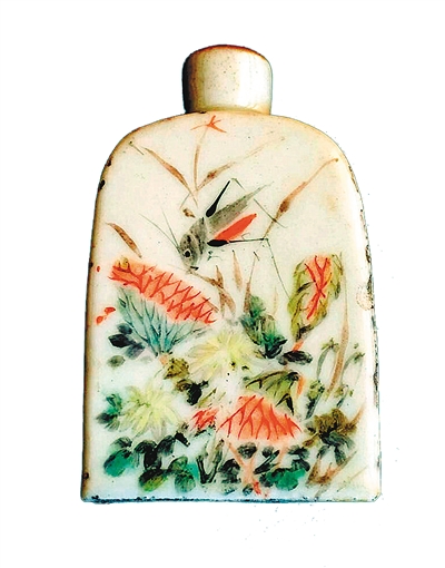 蟲草紋淺絳彩鼻煙壺。這是一只產(chǎn)于民國時(shí)期的淺絳彩鼻煙壺,它直口、削肩,分四面,底為四邊形,口徑1.5厘米,高6.5厘米,底部長(zhǎng)4.7厘米,寬2.9厘米。在較寬的兩面上,分別有圖案和題款,圖案為菊花秋蟲圖。只見菊花葉子肥大而茂盛,花朵碩大而鮮艷,遠(yuǎn)處有蘆葦草葉,其上有一只秋蟲,正趴在草葉上,貪婪地吮吸著上面的露水或草汁,題款為“太平有象題字”。較窄的兩面沒有圖案或題字,邊緣處有所磨損。
