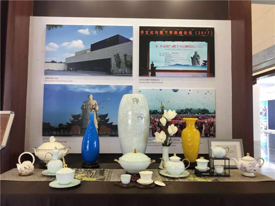 展臺上的一件件瓷器散發(fā)著迷人魅力,與墻上懸掛的齊文化博物院和足球博物館的大幅照片遙相呼應(yīng),齊風(fēng)陶韻,仿佛在輕輕訴說著淄博古老的文化底蘊(yùn)和現(xiàn)代創(chuàng)新的完美融合。
