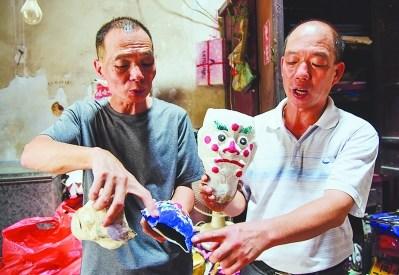 前場(chǎng)陳氏傳統(tǒng)糊紙技藝傳承人陳賜勇、陳賜堅(jiān)展示紙質(zhì)人偶面具。