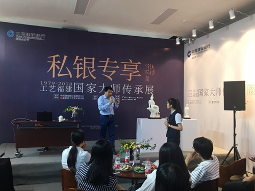 “認(rèn)得當(dāng)下真——2018工藝福建國家大師傳承展”正在福州建行大廈展出中。9月29日,建行私人銀行舉辦“認(rèn)得當(dāng)下真”私銀專享·大師面對面——陶瓷專場講座活動,中國工藝美術(shù)大師連紫華為大家?guī)硪粓雒麨椤兜禄状傻墓磐駚怼返闹黝}講座。
