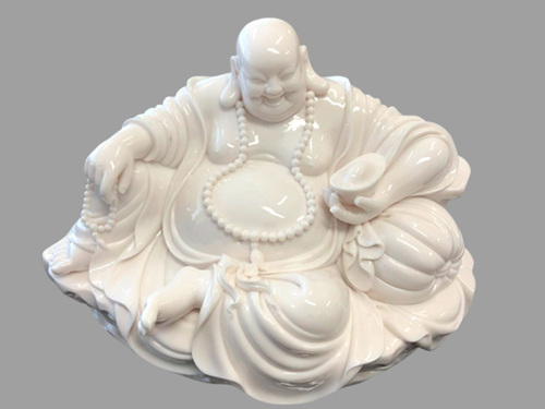 明代德化窯白瓷別具一格,宗教人物瓷塑更是德化窯最負(fù)盛名的產(chǎn)品。“孩兒紅”彌勒佛承襲德化窯古法技藝,師法明代瓷雕大家何朝宗“何派”風(fēng)格?坍嬀(xì),五官細(xì)節(jié)豐富,頭飽滿,大耳垂,笑從容。形神兼?zhèn)洌录y深秀流暢,線條瀟灑迷人,質(zhì)地潔白、細(xì)膩如玉,高溫作用下,胎體細(xì)密,透光度好。運用于“孩兒紅”技藝,更顯得白里透紅,光亮照人,凸顯了彌勒佛圣潔光輝,具有極高的藝術(shù)價值和觀賞價值。
