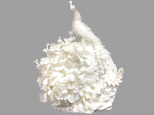 “孩兒紅”之丹鳳朝陽,匠心所運,巧用堆、推、雕、刻、捏、刮、接、貼等精制手法,綿柔堅致,潔白高雅,猶如雪凍霜凝,精致處更是細(xì)如毫發(fā)、絲絲可鑒。呈色溫潤如玉,剔透光滑,光線照耀,映見指影。深具明代瓷雕大家何朝宗“何派”風(fēng)格,展現(xiàn)瓷都千年藝術(shù)經(jīng)典傳承。