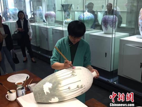 中國陶瓷藝術(shù)大師黃小玲展示“勾線分水”技藝。