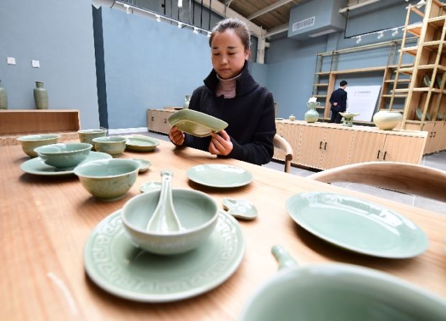 一名游客在位于耀瓷小鎮(zhèn)的大師創(chuàng)意園內(nèi)查看一件耀瓷工藝品。