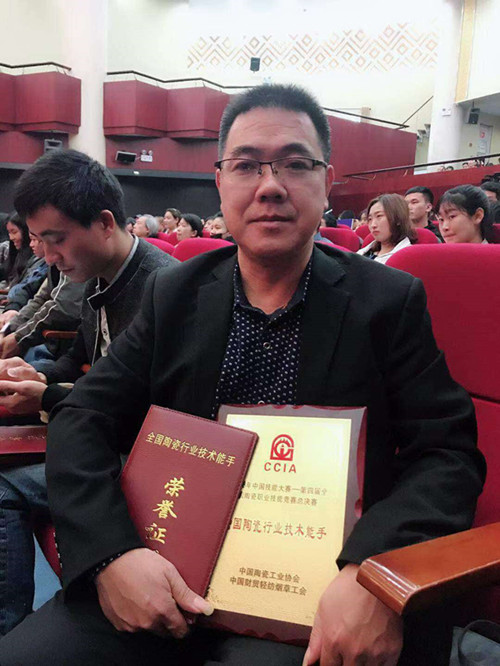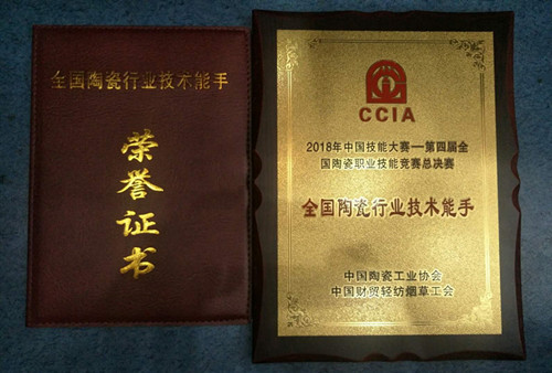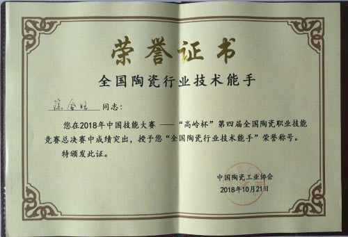 2018年10月21參加中國(guó)計(jì)能大賽第四屆全國(guó)陶瓷職業(yè)技能競(jìng)賽總決賽榮獲“全國(guó)陶瓷行業(yè)技術(shù)能手”稱號(hào)