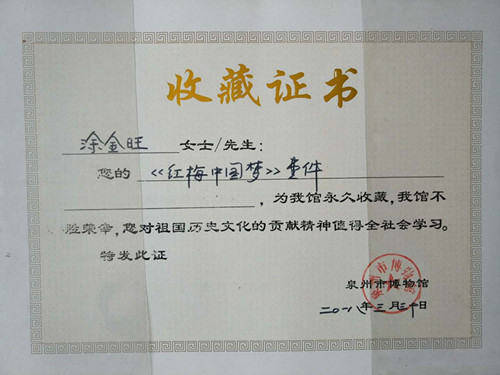 2018年3月《中國(guó)夢(mèng)梅花大瓶》,《傲骨寒梅》被泉州市博物館收藏
