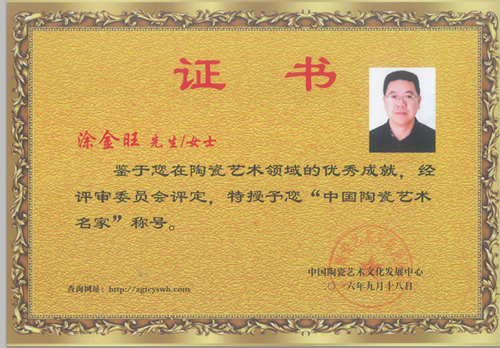 涂金旺,男,1970年出生于瓷都德化,畢業(yè)于福建師范大學(xué)美術(shù)系。中國(guó)陶瓷藝術(shù)名家,全國(guó)陶瓷行業(yè)技術(shù)能手,北京三江美術(shù)學(xué)院客座教授,泉州市工藝美術(shù)大師,中國(guó)東方文化研究會(huì)文教藝術(shù)委員會(huì)理事,福建省陶瓷協(xié)會(huì)會(huì)員、福建省技術(shù)能手、泉州市技術(shù)能手。