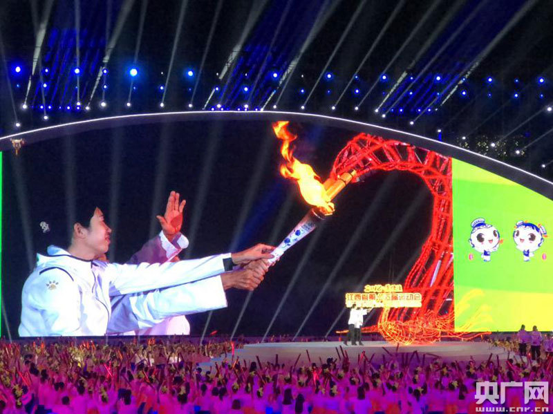10月28日,江西省第十五屆省運(yùn)會在景德鎮(zhèn)市隆重開幕。開幕式上,古窯把樁師傅胡家旺作為最后一棒火炬手,莊嚴(yán)地點(diǎn)燃了“朱雀”口銜的火柄,“朱雀”騰空而起與無人機(jī)相會,最終點(diǎn)燃了聳立在體育場上的主火炬,全場沸騰了!