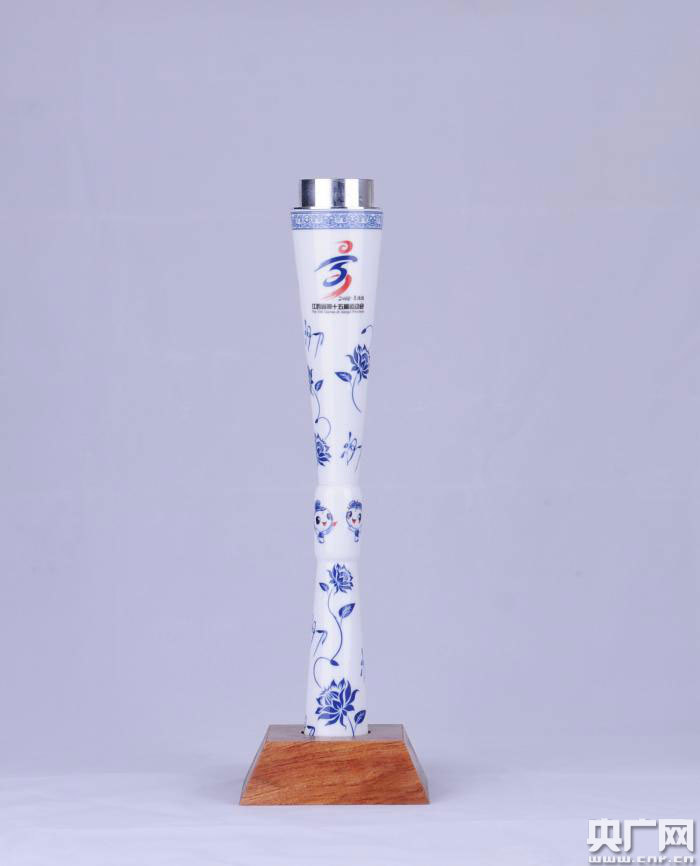 據(jù)介紹,本次陶瓷火炬的原創(chuàng)設(shè)計及設(shè)計顧問為景德鎮(zhèn)陶瓷大學(xué)的曹春生教授;鹁嬷黧w造型的設(shè)計靈感來源于一種仿青銅器造型的陳設(shè)用瓷——花觚,它的造型雋秀,端莊大方。火炬的花面設(shè)計采用傳統(tǒng)青花工藝?yán)L制,包含了蓮花和茶花的圖案。其中蓮花象征著圣潔高雅、品德高尚,而茶花作為景德鎮(zhèn)市的市花,蘊(yùn)含著景德鎮(zhèn)市市民對生活欣欣向榮的美好愿景;鹁娴纳喜亢椭胁糠謩e展示了本屆省運(yùn)會的會徽與吉祥物,傳統(tǒng)與創(chuàng)新彼此交融,相得益彰。