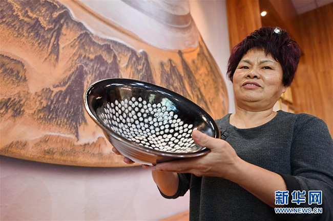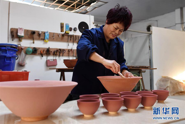 10月29日,建陽建盞傳統(tǒng)技藝傳承人李細(xì)妹在給建盞坯體上釉。