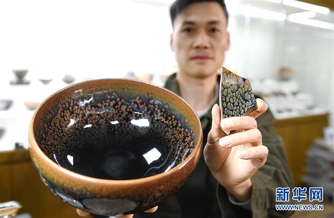 10月29日,建陽建盞傳統(tǒng)技藝傳承人周建平在展示他燒制的鷓鴣斑建盞(左)和宋代鷓鴣斑建盞碎片。