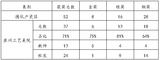 泉州工藝美術(shù)職業(yè)學院教師、校友成為德化產(chǎn)瓷區(qū)獲獎的主力軍,占據(jù)71%的獲獎份額。教師邱玫瑰《游園﹒今夢》、張南章《唐太宗》、莊虹虹《希望的田野》、黃永星《何朝宗》(NO.3雕塑)、鄭振雷《衣襟飄香》(8頭文具)等5件作品獲得金獎,邱玫瑰《園林清曲》、張麗芬《女人與貓系列》(3件)、鄭振雷《當局者》、高越《畔山云!返4件作品獲得銀獎,周金田《逐夢》、許慶!逗<{百川》、梁雙升《自然神曲》、陳名昭《阿爾法城考古報告》等4件作品獲得銅獎。在德化報名參評的泉州工藝美術(shù)職業(yè)學院畢業(yè)生,獲得1金、9銀、14銅。此外,泉州工藝美術(shù)職業(yè)學院舉辦的國家藝術(shù)基金“白瓷瓷塑藝術(shù)創(chuàng)新人才培養(yǎng)”研修班學員,在德化學習期間創(chuàng)作的作品,也獲得1金、1銀、4銅的好成績。