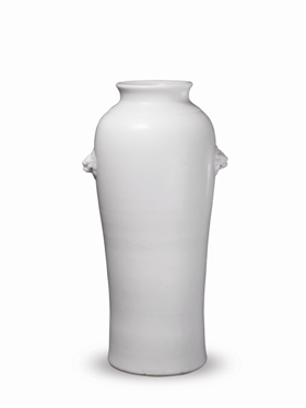 另一件清代德化窯白釉獅耳筒式瓶(圖2)。瓶高30、最大徑16、口徑8、底徑10厘米;圓唇、侈口、溜肩、斜直腹內(nèi)收、足微外撇、圈足;瓶上腹兩側(cè)對稱堆塑獅頭狀鋪首;除足跟外通體施白釉。