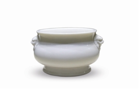 明宣德款德化窯白釉獅耳香爐(圖3),高8.3、口徑12、足徑9.7厘米;唇口,束肩,鼓腹,腹下至底足處微向外撇,圈足。足內(nèi)暗刻篆體“大明宣德年制”六字三行款。爐通體內(nèi)外施白釉,釉色瑩潤,白中泛黃。肩部左右各置一獅頭形耳。整體造型大氣沉穩(wěn),比例協(xié)調(diào),其耳部的堆貼技法,是明清德化窯瓷器中常用手法,將動物形象與器皿融為一體,構(gòu)思新穎,搭配巧妙。