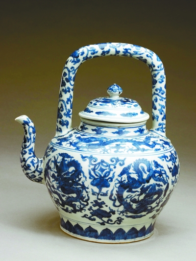 一把隆慶時期的青花團(tuán)云龍紋提梁壺是本次展覽的重點展品。“根據(jù)專家們的研究,同類的隆慶御窯提梁壺存世量僅在兩到三把,故宮博物院僅藏一把。”冀洛源介紹,這把提梁壺與同時期的其他壺有一些區(qū)別。首先,同時期的壺一般都是壺柄跟壺流位于壺身相對應(yīng)的兩側(cè),而這把青花瓷壺則是仿照宋元時期常見的提梁壺做法,將壺柄放在壺肩部。此外,與其他作為生活用器的壺不同,這把青花團(tuán)云龍紋提梁壺體量很大,更可能為陳設(shè)用器。“從紋飾上看,這把壺的紋飾已經(jīng)與明代中前期推崇的清雅風(fēng)格不同,顯現(xiàn)出繁縟、華麗的狀態(tài)。”