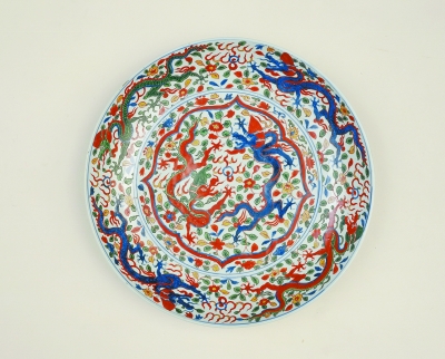 萬歷五彩瓷器的藝術(shù)風(fēng)格在本次上展的一件五彩龍穿花大盤上得到了淋漓盡致的體現(xiàn)。其造型、紋樣繁多,花紋布局繁密,但卻十分嚴(yán)謹(jǐn),一絲不亂。而用筆更顯豪放不羈、樸實稚拙,呈現(xiàn)出一種華麗濃艷之風(fēng)。