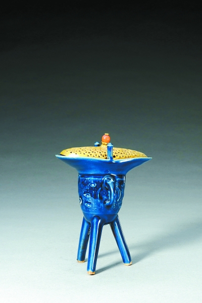 展柜中,一件故宮博物院藏的明嘉靖祭藍(lán)爵杯與一件景德鎮(zhèn)御窯廠遺址出土的澀胎爵杯殘片標(biāo)本呼應(yīng)展出,觀眾既可以看到精美、完整的皇家祭祀用器,也可以看到爵杯尚未上釉、“素面朝天”的樣子。“上過釉的瓷器,有時會遮掩了器物原有的紋飾。從這件還沒上釉的標(biāo)本上,我們可以看出,事實上它胎體表面的紋飾是仿照青銅禮器制作,而且還使用了‘錐拱’和‘堆塑’的工藝。只不過鋪在表面的釉層,讓它們變成了‘暗紋’。”