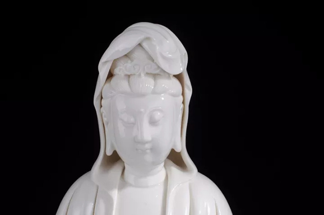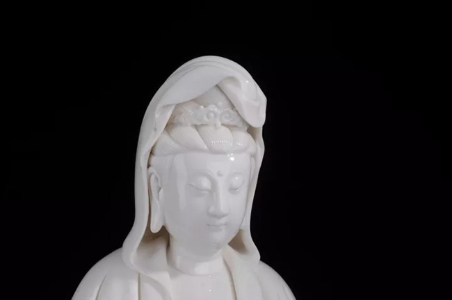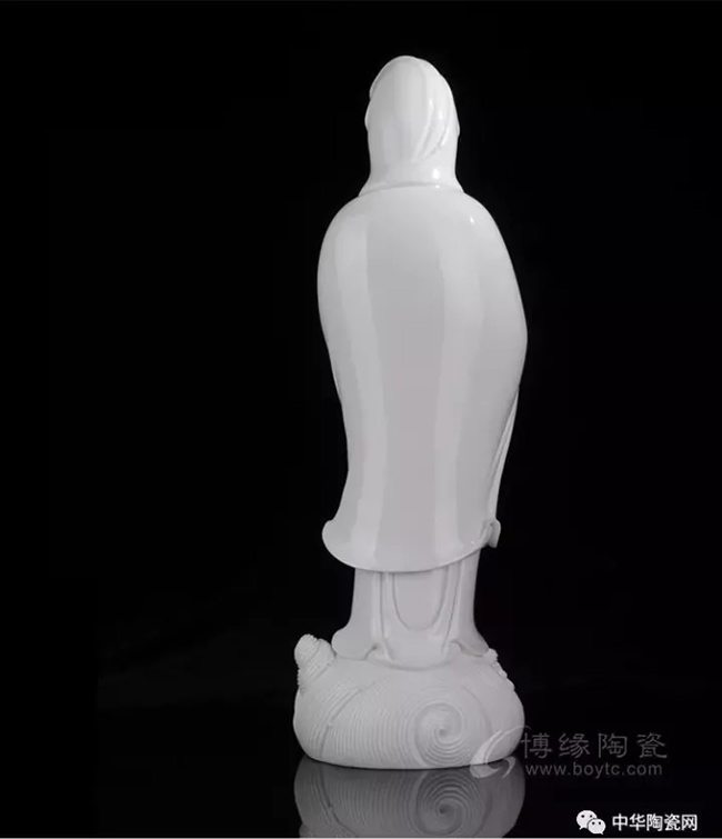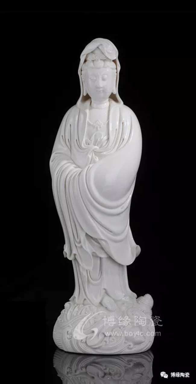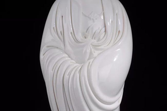 作品《渡海觀音》傳承何派觀音雕塑風(fēng)格,以德化特有的溫潤如玉的“中國白”為胎質(zhì),純手工制作,作品圓勁有力如凝脂似玉,滋潤瑩滑,神情嫻雅平靜,安詳自若,雙目低垂凝思,衣紋線條清晰、簡潔、瀟灑,多變化,柔媚流暢,翻轉(zhuǎn)自然,觀音雙手藏袖,露一足踏蓮花,另一足水花掩蓋,作踏浪凌波渡海之勢刻畫的栩栩如生。經(jīng)高溫1300多度燒制,整尊造像美倫美煥,活靈活現(xiàn),是一件上乘之品。
