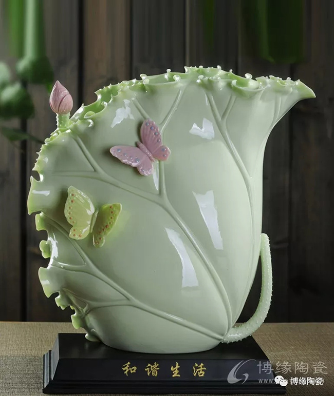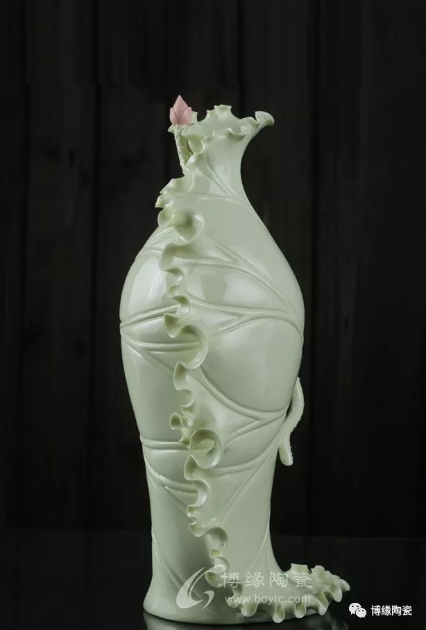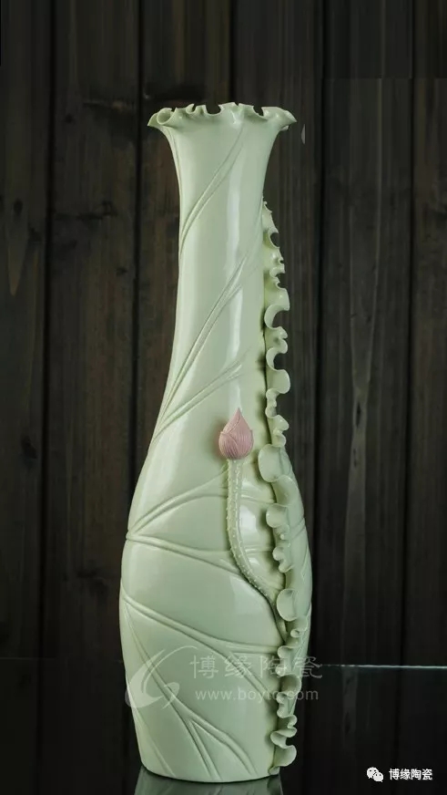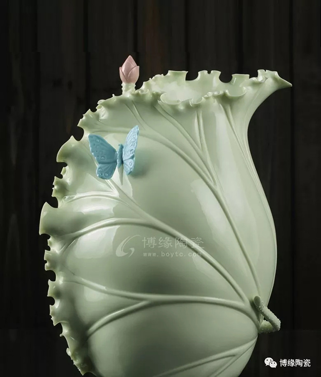 《荷葉瓶》以荷葉為主體,外形呈一片上卷的荷葉,口沿外卷,自然翹曲,呈不規(guī)則的連幅弧型,葉脈清晰;以小荷花苞為點綴的花瓶,造型優(yōu)美,清新素雅。