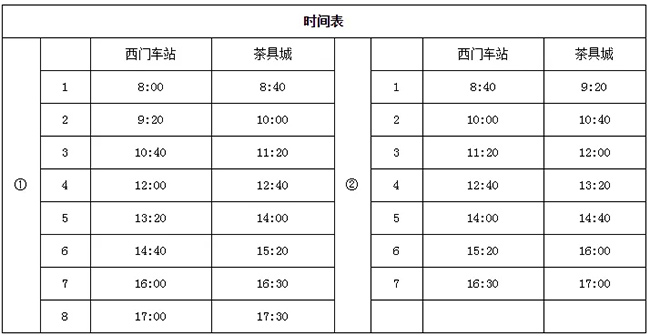 根據(jù)縣政府及交通主管部門的要求,為滿足第一屆茶博會群眾出行的交通需求,2018年12月19日至23日,我司開通一條臨時公交線路,由西門車站發(fā)車,途徑丁溪橋、南門、一實小、南環(huán)公寓、嘉盛花苑、寶美職工公寓、寶美開發(fā)區(qū)、銀晟陶瓷,終點為茶具城的公交線路。票價:一票制2元。具體發(fā)車時間表如下: