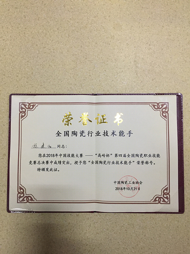 陳建陽榮獲“全國陶瓷行業(yè)技術(shù)能手 ”