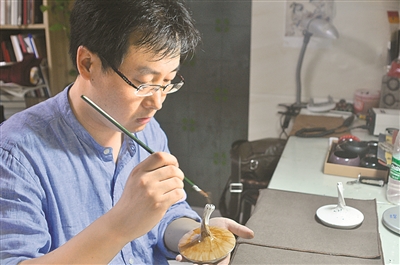 傳道授業(yè)的同時,潘壘每天都要騰出幾小時,沉浸在漆藝形態(tài)、圖示、材料與工藝制作中。他還精通漆藝中的金繕修復,“物品同人生一樣,難免有磕磕碰碰之時。得益于天然大漆的融合性,漆藝的各種技法均可為金繕修復服務。”潘壘說,要修復一件瓷器,工期至少一個月。從前期的清理、拼接、補缺,到后期的補漆、裝飾、罩光,每道工序都需異常細心。