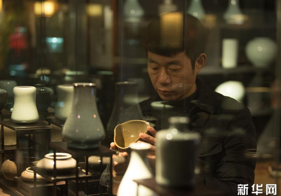 1月16日,陳衛(wèi)武在“宋韻”展廳查看自己燒制的一件器物。
