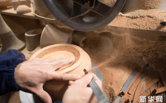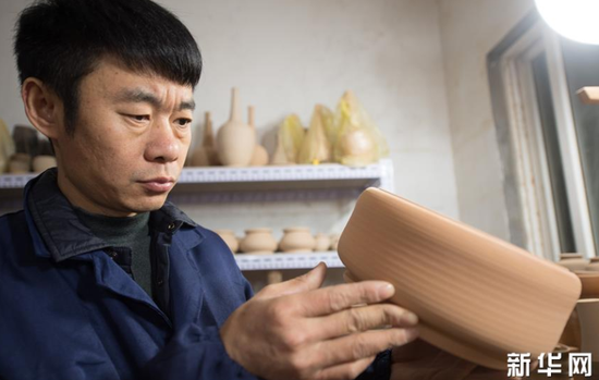 1月16日,陳衛(wèi)武在工作室查看一件青瓷洗坯體的線條。