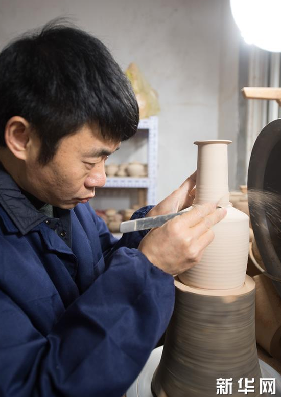 1月16日,陳衛(wèi)武在工作室為一件青瓷瓶修坯。