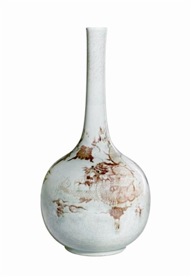圖1所示這件清雍正釉里紅龍紋油錘瓶,高42.5、口徑4、足徑11厘米,通體飾淡青釉,頸口及器身局部釉面有細開片,釉色瑩潤。腹部以釉里紅描繪一四爪蛟龍,周圍飾以云氣及火焰,圖案充滿動勢。主體圖案之外,器身無過多裝飾,簡練明快,整體配色柔和。圈足刮釉露胎,外底白釉無款。油錘瓶是瓶的一種式樣。器型大多小口,細長頸,圓腹,圈足,形似榨油作坊用的油錘,故名。這件雍正朝釉里紅油錘瓶發(fā)色純正,品相極佳,現(xiàn)收藏在清華大學藝術博物館。