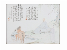 淺絳《浴馬圖》瓷板畫,長42.5、寬34厘米。在柳陰花枝下,河塘岸邊,靜坐著一位精神矍鑠、面目清瘦的老者,人物開相寫實而古樸。淺水中站立的駿馬,健壯而溫順。兩名童子簡筆勾勒,卻生動而傳神,一位童子手持水煙袋靜心守候,另一辛勤勞作。畫面刪繁就簡,主次分明,文人氣息撲面而來。