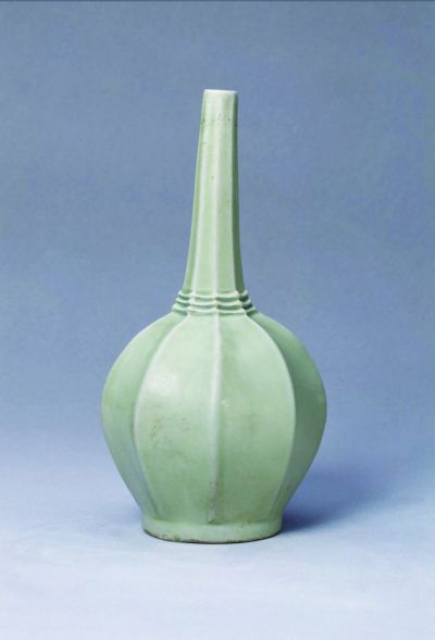 1987年法門寺塔考古發(fā)掘出的14件越窯秘色瓷中,除兩件為青黃色外,其余均釉面青碧,胎質(zhì)細膩,晶瑩潤澤,有如湖面一般清澈碧綠。其中的一件八棱凈水秘色瓷瓶更是被學(xué)術(shù)界稱為“一個突破性發(fā)現(xiàn)”。它高21.5厘米,最大腹徑11厘米,口徑2.3厘米,重615克。八棱凈水秘色瓷瓶瓶頸細長,直口,圓唇,肩部圓隆,腹呈現(xiàn)瓣狀瓜棱形,圈足稍稍外侈。在瓶頸與瓶身相接處裝飾有相應(yīng)的八角凸棱紋三周,呈階梯狀。其造型十分優(yōu)雅,端莊規(guī)整,線條流暢,通體施明亮青釉,瓷化程度極高,這一造型在唐代可以說極具審美創(chuàng)意。該瓶在出土?xí)r,瓶口原覆一顆大寶珠,瓶內(nèi)裝29顆五色寶珠,從佛教儀軌上判斷,此瓶應(yīng)屬密教供養(yǎng)器之“五賢瓶”或“五寶瓶”之類。該凈瓶未列入《衣物帳》記載中,也未與其他秘色瓷一并放置,而是單獨發(fā)現(xiàn)于地宮中室第二道門前側(cè)。后經(jīng)專家鑒定,瓷瓶的釉色、胎質(zhì)與其他秘色瓷完全相同,應(yīng)該算在秘色瓷的行列之中。因此它仍是晚唐越窯秘色瓷之精品。西安唐咸通十二年張叔尊墓出土一件類似凈瓶,北京故宮博物院亦藏一件。