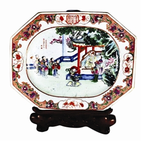最近剛拍得一個長方八角粉彩人物故事大盤(41×33厘米)(見圖),初看紋飾是清嘉慶年的外銷瓷。盤邊沿四周飾以錦地花卉如意紋,盤中繪制《唐明皇梨園調(diào)舞圖》。