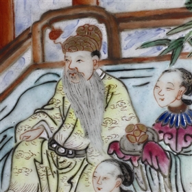 綜上所述,我認為這盤的出現(xiàn)可能有以下幾種情況。一、嘉慶年間為玉堂仙館定燒物,不屬于外銷瓷,而是設(shè)計者借用外銷瓷的風(fēng)格;二、玉堂仙館主人認識老外朋友,比如傳教士、外交官等大咖,以此設(shè)計老外喜歡的紋飾定燒后送給老外作為禮物;三、嘉慶皇帝定燒送給玉堂仙館主人;四、嘉慶年間有地位和有權(quán)勢的人定燒送給玉堂仙館主人;五、玉堂仙館自己的定燒物?傊@個盤子的紋飾非常少見,希望有興趣的朋友共同探討研究。