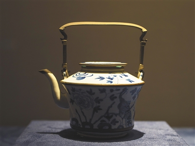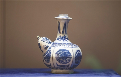 幾件青花軍持——乳房狀注口瓷水壺花紋淡雅別致,線條圓潤。據(jù)介紹,軍持最初使用跟印度佛教密切相關(guān)。13世紀(jì)中后期伊斯蘭教傳入東南亞并得到進(jìn)一步發(fā)展后,軍持繼續(xù)為當(dāng)?shù)厝嗣袼谩?ldquo;軍持這種器型在當(dāng)時(shí)的中國國內(nèi)是不多見的,一般都是為東南亞國家專門訂制。當(dāng)時(shí),東南亞人民對這一器物需求量大,所以,今天我們能夠在東南亞地區(qū)發(fā)現(xiàn)大量遺存。”故宮博物院器物部研究館員、該展策展人董健麗說。