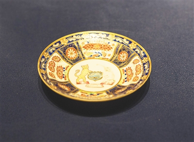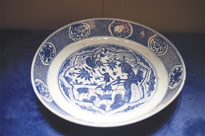 尺寸頗大的瓷盤是展覽中出現(xiàn)較多的瓷器。仔細(xì)觀察,許多瓷盤上還寫著阿拉伯文。據(jù)介紹,東南亞一帶的聚會(huì)或宴會(huì)上,有一些以席鋪地,大盤置于席中,盤中盛滿米飯、魚肉并澆咖喱湯汁,大家圍坐一起,以手撮飯而食。通常情況下,宴會(huì)上四至八人共用一個(gè)大盤,可見大盤盛裝飯量之大。傳入東南亞的陶瓷飲食器具,多為宴會(huì)時(shí)使用的諸如“克拉克瓷”的大盤。