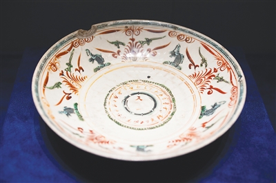 展品中還有一件漳州窯紅綠彩魚藻羅經(jīng)文大盤,將羅盤紋樣繪制在盤的內(nèi)底。據(jù)介紹,當(dāng)時(shí),羅盤上還應(yīng)置有羅針,整件瓷盤類似針碗。這件實(shí)用瓷器也充分反映出依海而生的東南亞人民對指南針的崇敬之情,展示出源遠(yuǎn)流長的航海文化。