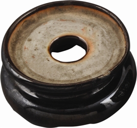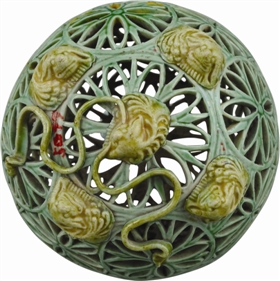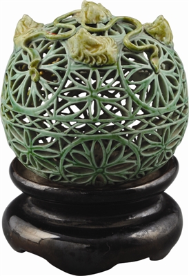 江西省博物館收藏的這件清光緒綠釉鏤空瑞獸輪花紋香薰(圖1),通高8.4、球徑6.5厘米。香薰上為球體,面施綠釉,球頂部貼塑五只瑞獸(圖2),施淡黃釉,居中者口銜飄帶,球體空心,球面以菱花帶紋分隔為上下兩層,各鏤雕輪花四大朵,形如四個(gè)開(kāi)光,勻分四方,大朵花間鏤出小輪花;底部鏤空輪花一朵,下附一烏金釉底座(圖3)。