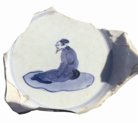 本文要介紹的這組明清時期青花瓷片上畫的都是“高士”。當(dāng)時的工匠把筆下線條表現(xiàn)在瓷上,幽谷之中,坐聽松風(fēng)泉鳴,全畫空寥寂靜。這讓我想到張大千的“高士圖”,那是他西康之游后的作品。與這些瓷畫相近的,都是高士思想與所游真景簡筆結(jié)合,或獨行獨坐,或絕塵孤思,幽然孤嘯,大有欲往從之游,愿言成獨往的幽靜境界。