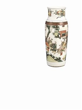 器高36.4、口徑12.1、底徑11.3厘米。侈口,束頸,溜肩,直筒形長腹,平底。器壁較薄,里外施白釉,釉面堅(jiān)致。彩繪以紅、綠、黃為主,綠釉濃厚瑩潤,黃彩汁潤鮮亮,礬紅深沉顯棗皮紅,具大明彩”韻味。五彩邊緣的白釉處圍有一環(huán)五光十色的光暈,說明彩釉年代古老。